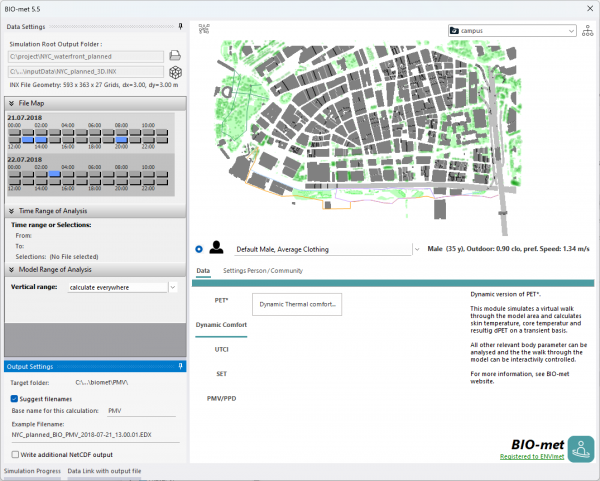 However, it is important to understand, that a proper Thermal Comfort Index can only be calculated if the microclimate data used are correctly and/or sense-full. First you need valid ENVI-met simulation output, then you can calculate Thermal Comfort.