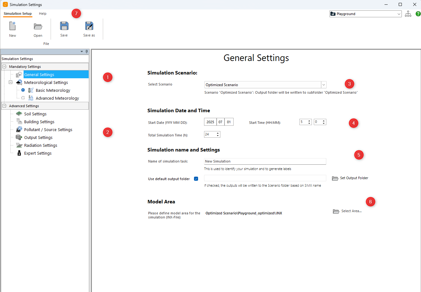 Additionally you need to define the Simulation Name and Output folder (5) as well as select the Model area file for the simulation (6).
