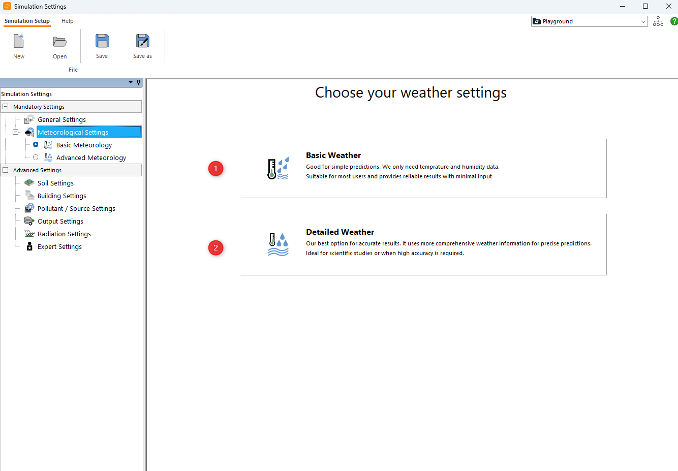 The Mandatory Settings include the General Settings of the Simulation and the choice of Meteorology.