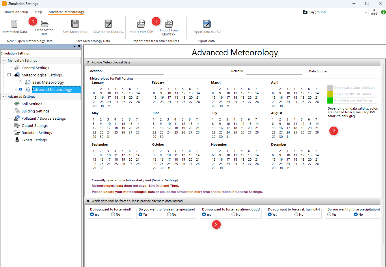 In the Advanced Meteorology Settings you need to import either a .EPW, .TRY or .CSV file containing weather data (1)
