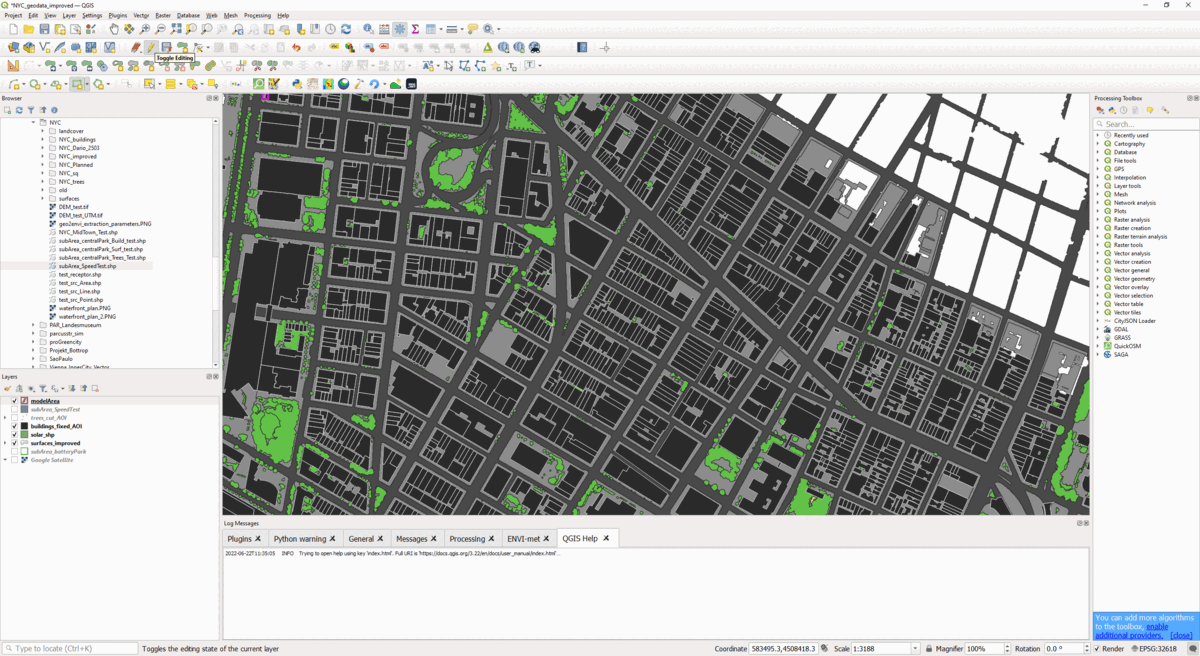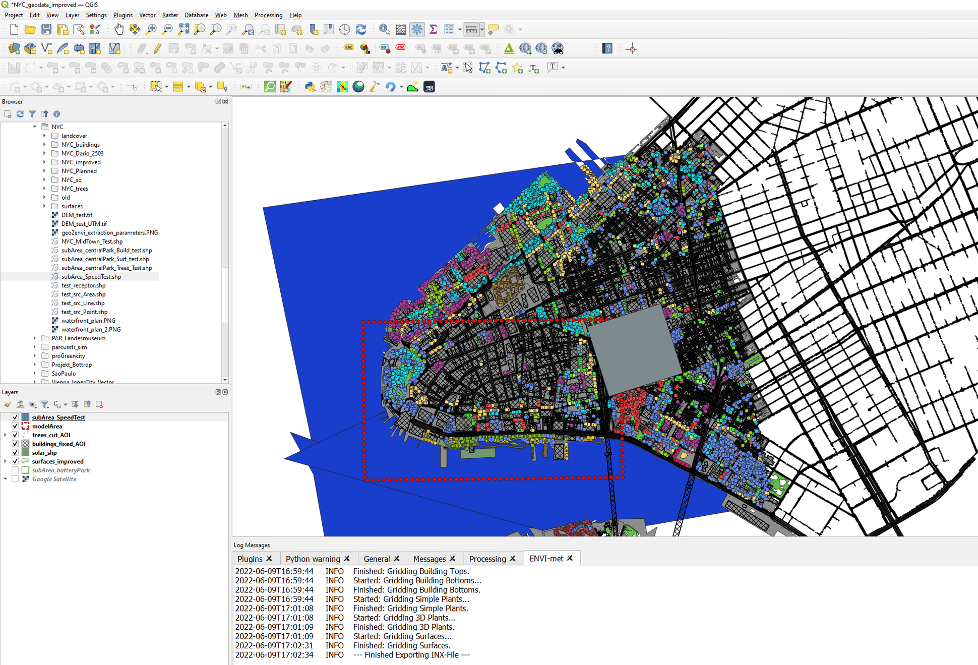 With the plugin, you can quickly create ENVI-met model areas based on geodata. These model areas can then be used to run a microclimate simulation with the ENVI-met.