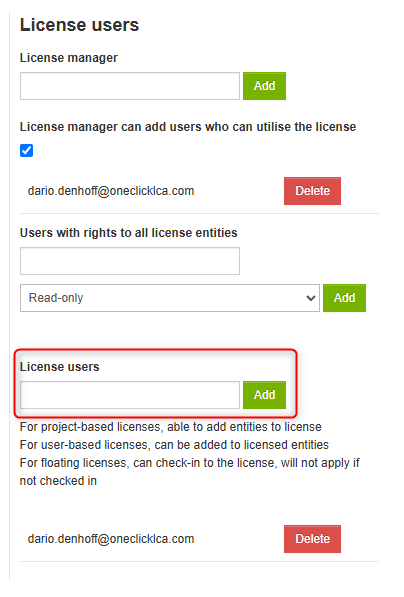 Users with Rights to All License Entities: Add users here to give them access to all current and future projects. These users must already have a One Click LCA account. You can assign them read-only, modifier, or manager rights.