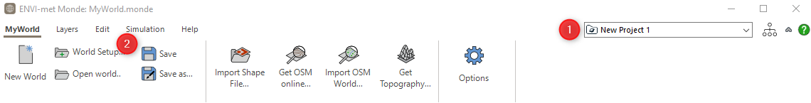 As a first step, similar to most other programs of the ENVI-met Suite, you should select the project you are working in (1). Before creating a new map in Monde, you will need to setup your geographic location. You can do this via the World Setup button (2) in the MyWorld Tab. Here, you can assign a name to your map and define a location in UTM coordinates. This is important if you e.g. load OSM data into your map and for the simulations later on. When importing shapefiles which already have a geographic reference, you do not need this step.