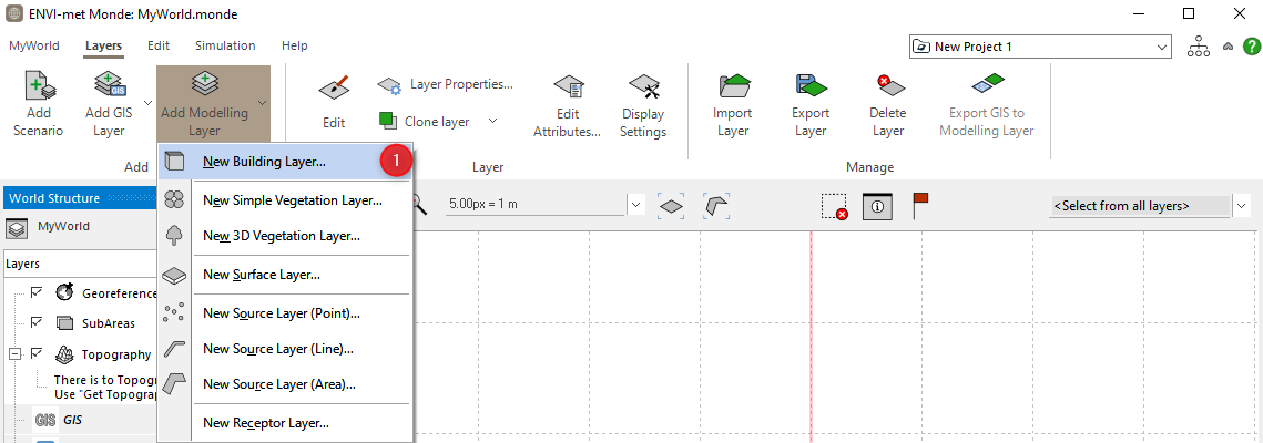 In order to create your own modeling layers in Monde, you can simply add a modelling layer in the Layers tab. Here, you can choose the type of modelling layer you would like to digitize (1). These types coincide with the ENVI-met layers buildings, simple and 3D vegetation, surface, point, line, or area source, and receptor.