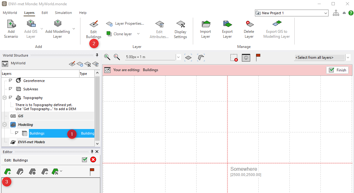 If you e.g. decide to create a building layer, the layer will appear as a modelling layer on the left-hand side (1). With the respective layer selected, you can start editing the layer (2) and digitize your building (3).