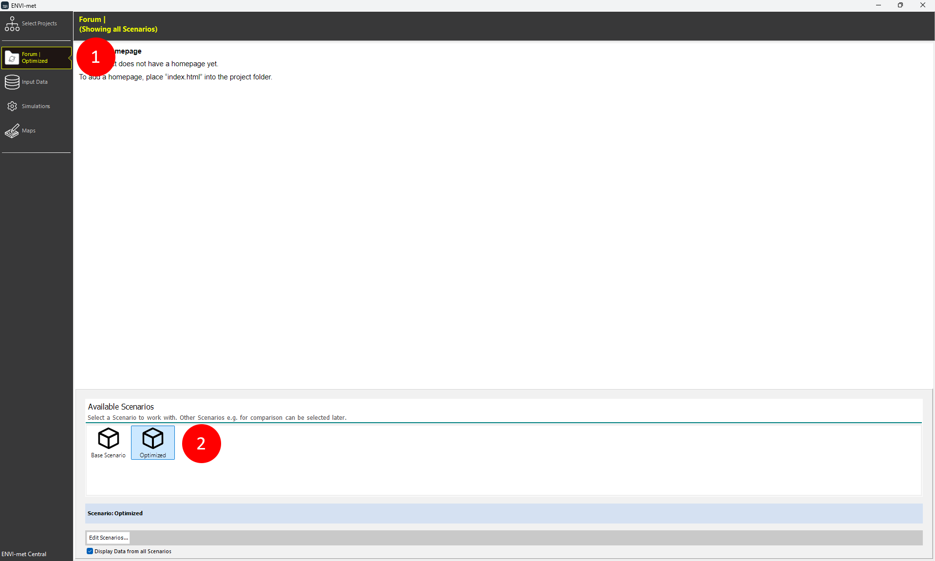 Click on your Project in the sidebar (1). The available scenarios will appear in the bottom (2).