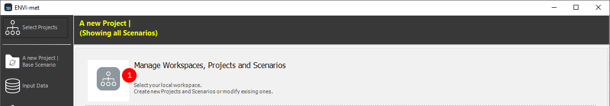 The Workspace Manager helps you set up your ENVI-met Workspace (the directory in which your project folders are located) and manage your Projects and Scenarios.